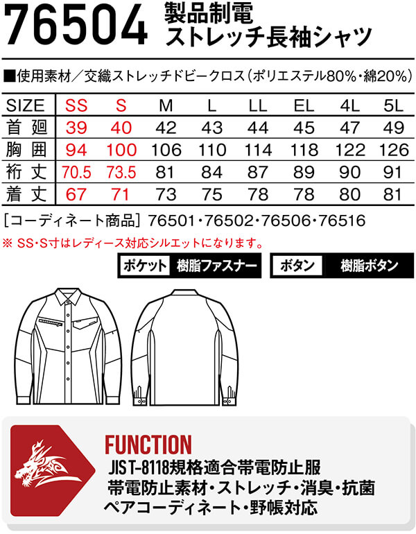 スペック メーカー 自重堂(JICHODO) 品番/シリーズ 76504 76502/Z-DRAGON 76500シリーズ ※このシリーズの商品はコチラ シーズン 春夏物 商品名 製品制電ストレッチ長袖シャツ&製品制電ストレッチノータックカーゴパンツセット(上下同色) 素材 交織ストレッチドビークロス (ポリエステル80%・綿20%) 仕様 JIS T-8118規格適合帯電防止服、帯電防止素材、ストレッチ、消臭、抗菌、ペアコーディネート(シャツ)、野帳対応(シャツ) ※シャツ:SS・S寸はレディース対応シルエットになります。