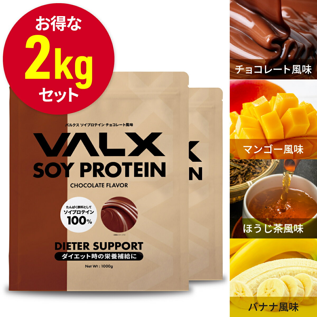 [エントリーP5倍30日23:59マデ]VALX ソイプロテイン【4つの味から選べる2Kgセット】1kg×2袋 (2kg) 植物性 大豆 プロテイン タンパク質 女性 ダイエット 糖質制限 筋トレ 山本義徳 チョコレート マンゴー バナナ ほうじ茶
