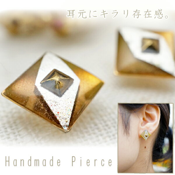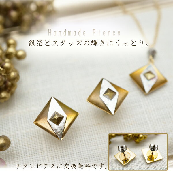 パーツから全て手作りしている一点ものになっております! ITEM INFORMATION特徴 四角のゴールドプレートにグラデーションで1/3程度ベージュ系の色を入れ、菱形に切った銀箔を貼り、真ん中にスタッズを留めました。