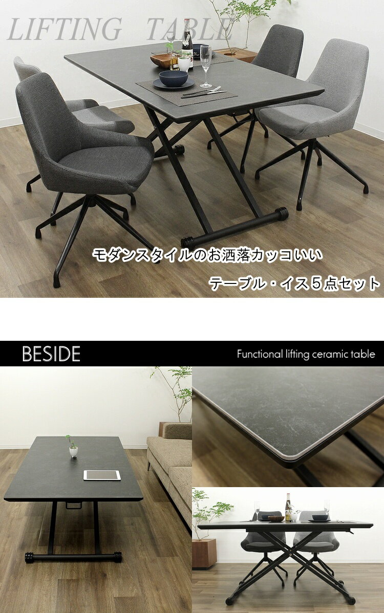 シリーズBESIDE 商品名 ダイニング5点セット 商品説明 ●モダンスタイルのお洒落カッコいいテーブルイスの5点セット ●天板にセラミックを使用したキズや摩擦熱に強いテーブルで、汚れにも強くサッと拭くだけでお手入れかんたん 見た目も石調のクールな印象で、大人の味わい深さを感じられます ●リビング・ダイニング兼用のテーブルとして便利に使えます 高さは30~76.5cmの範囲内で無段階に自由な高さ設定が可能なので、作業しやすい好みの高さで使えるのがとっても便利 ●ゆったりとしながらもフィット感のある座面で座り心地はとても快適です ●ザックリとしたファブリック生地で優しい雰囲気の回転椅子 色はグレー色(GY)とチャコールグレー色(CG)の2色あります ●座面が回転するため、立ち上がりは楽で機能面も充実 ●テーブル・チェア組立品 サイズ テーブル:幅140×奥行80×高さ30~76.5cm×1台 チ ェ ア:幅49×奥行53×高さ81(座面高43)cm×4脚 材質 テーブル:天板 6mmセラミック+30mmMDF 脚部 スチール(粉体塗装) チェア張地:ポリエステル 芯材:積層合板・ウレタンフォーム 脚部:スチール(粉体塗装) 送料 送料無料(一部地域は除きます。